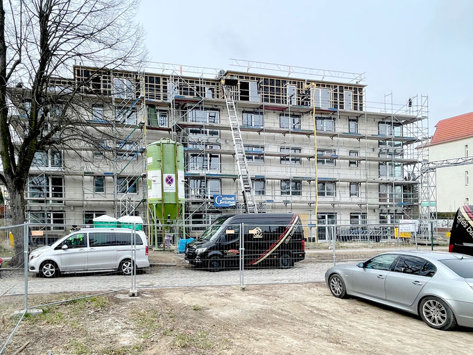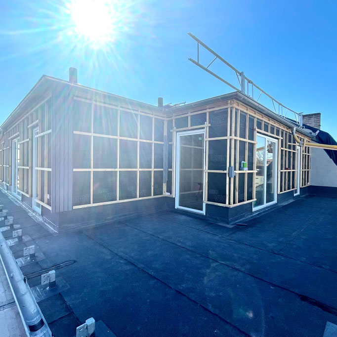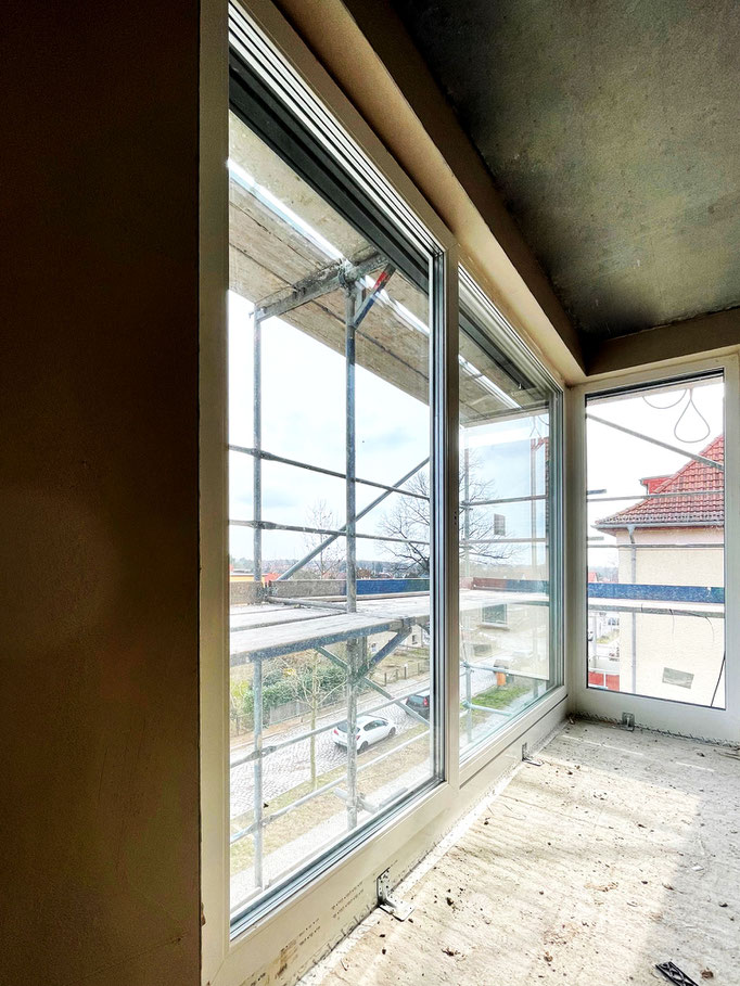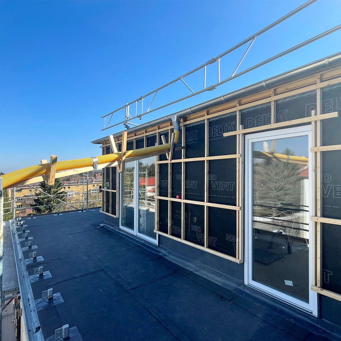 In Bohnsdorf geht es mit den Bauarbeiten ordentlich voran. Das Dach ist gedeckt. Alle Fenster, Sonnenschutzanlagen und Türen wurden bereits montiert. Diese kommen aus unserem Hause - eben alles aus einer Hand.
