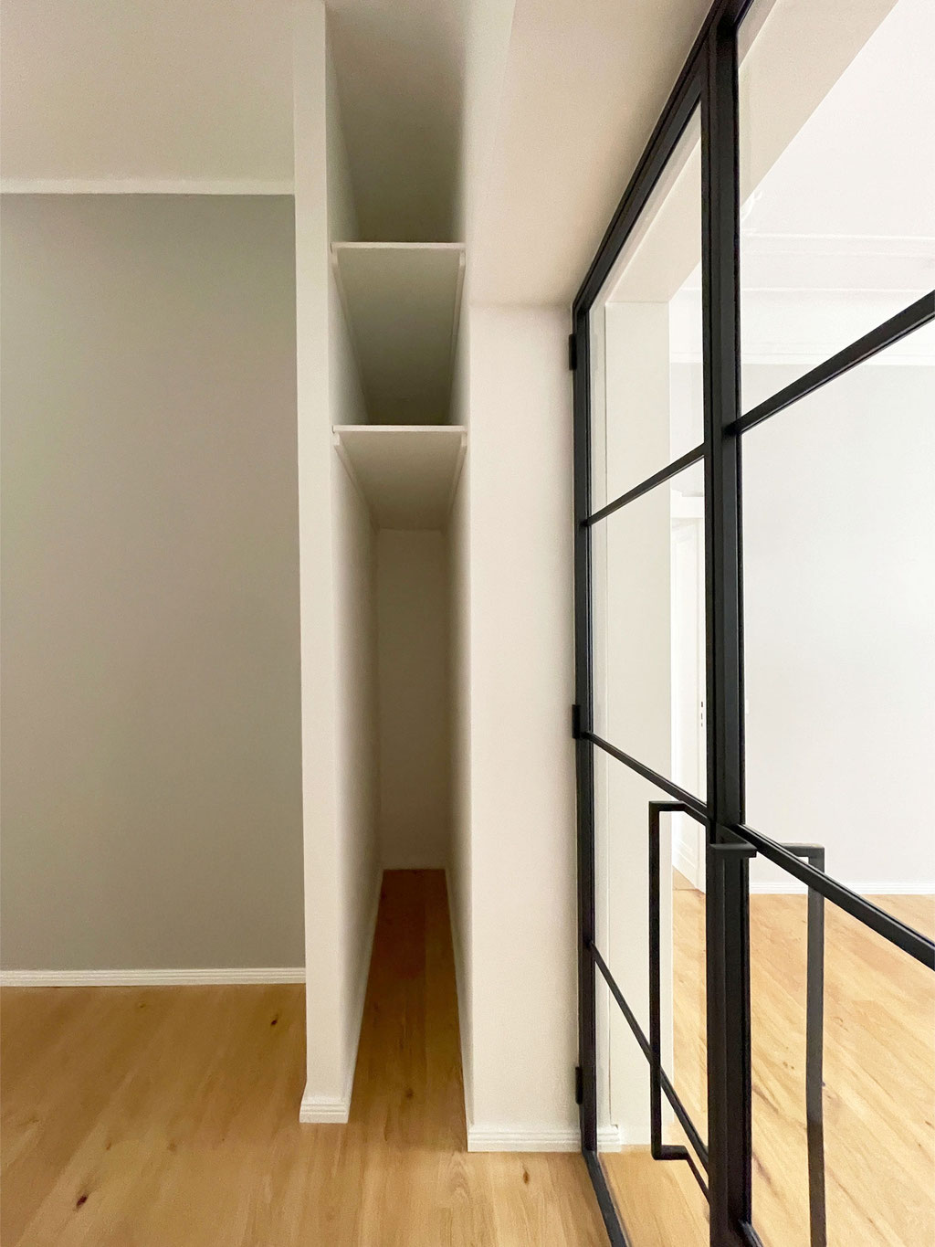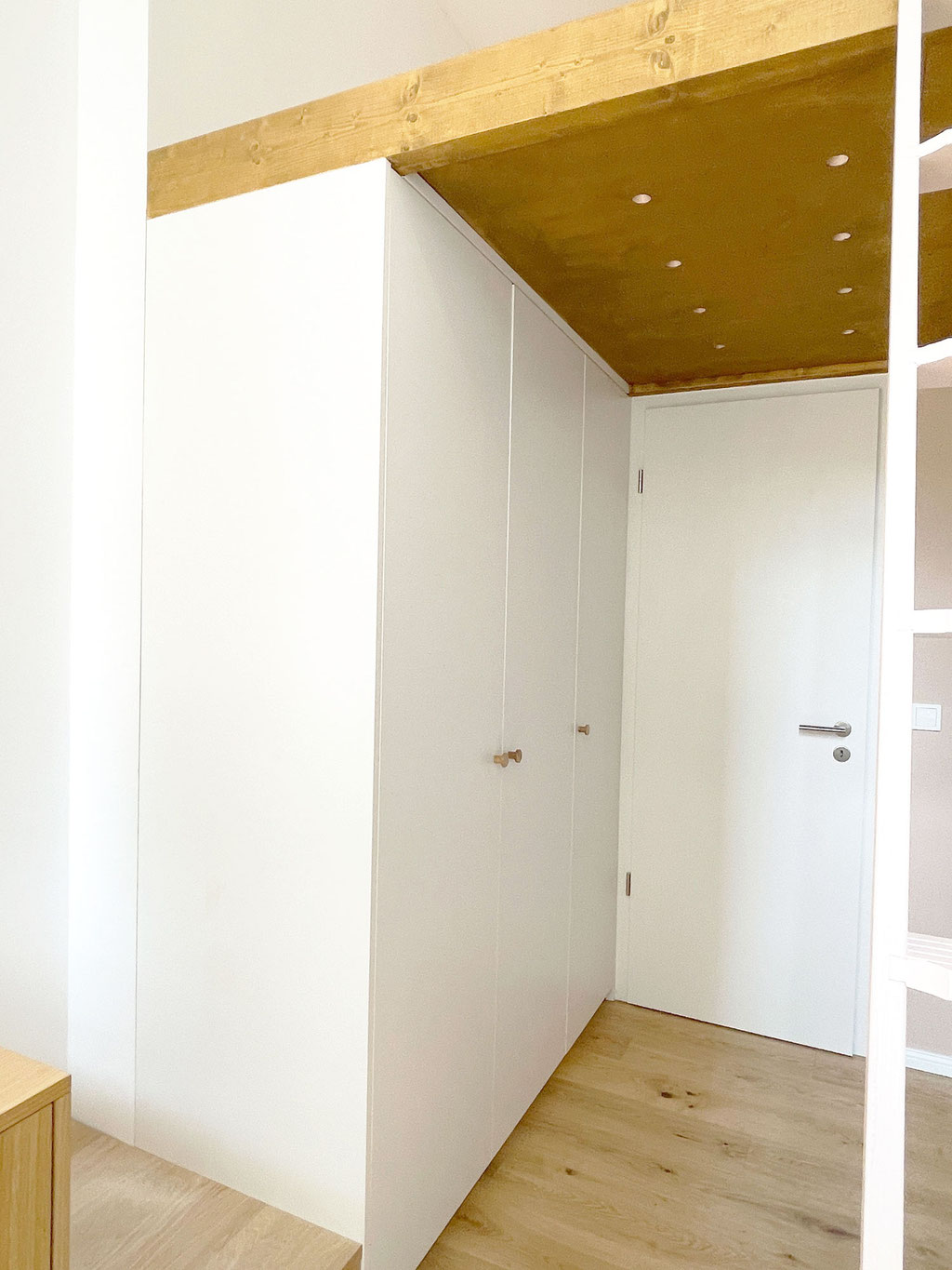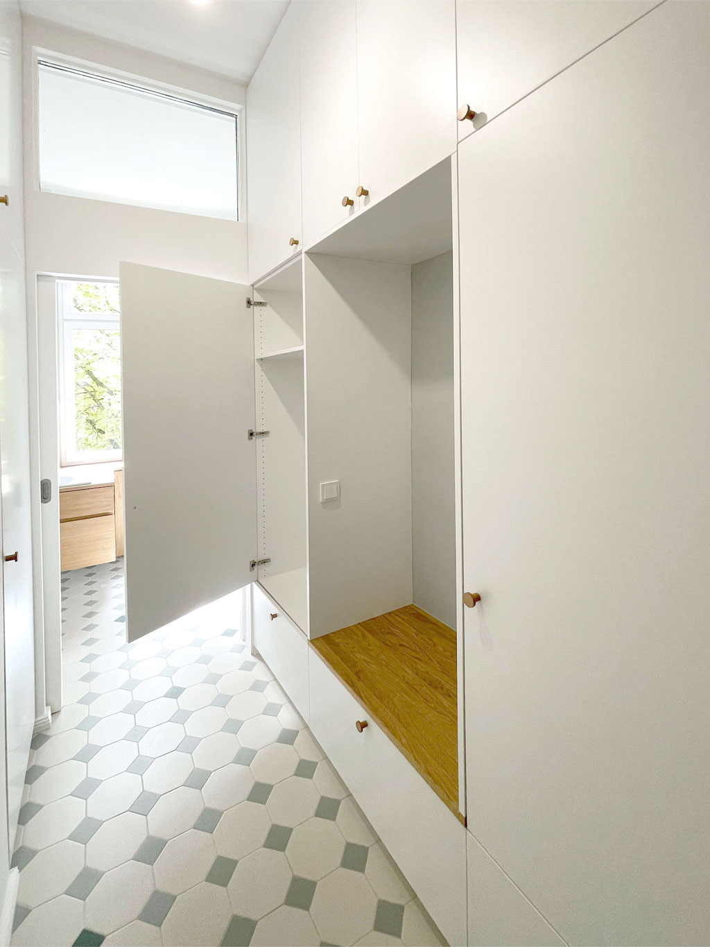 Maßgefertigte Einbauregale und integrierte Garderobe für optimale Raumnutzung