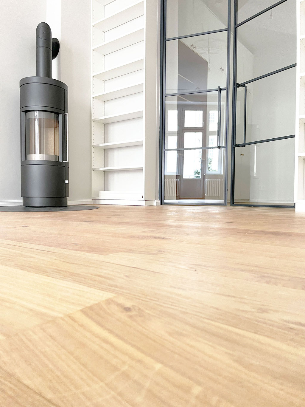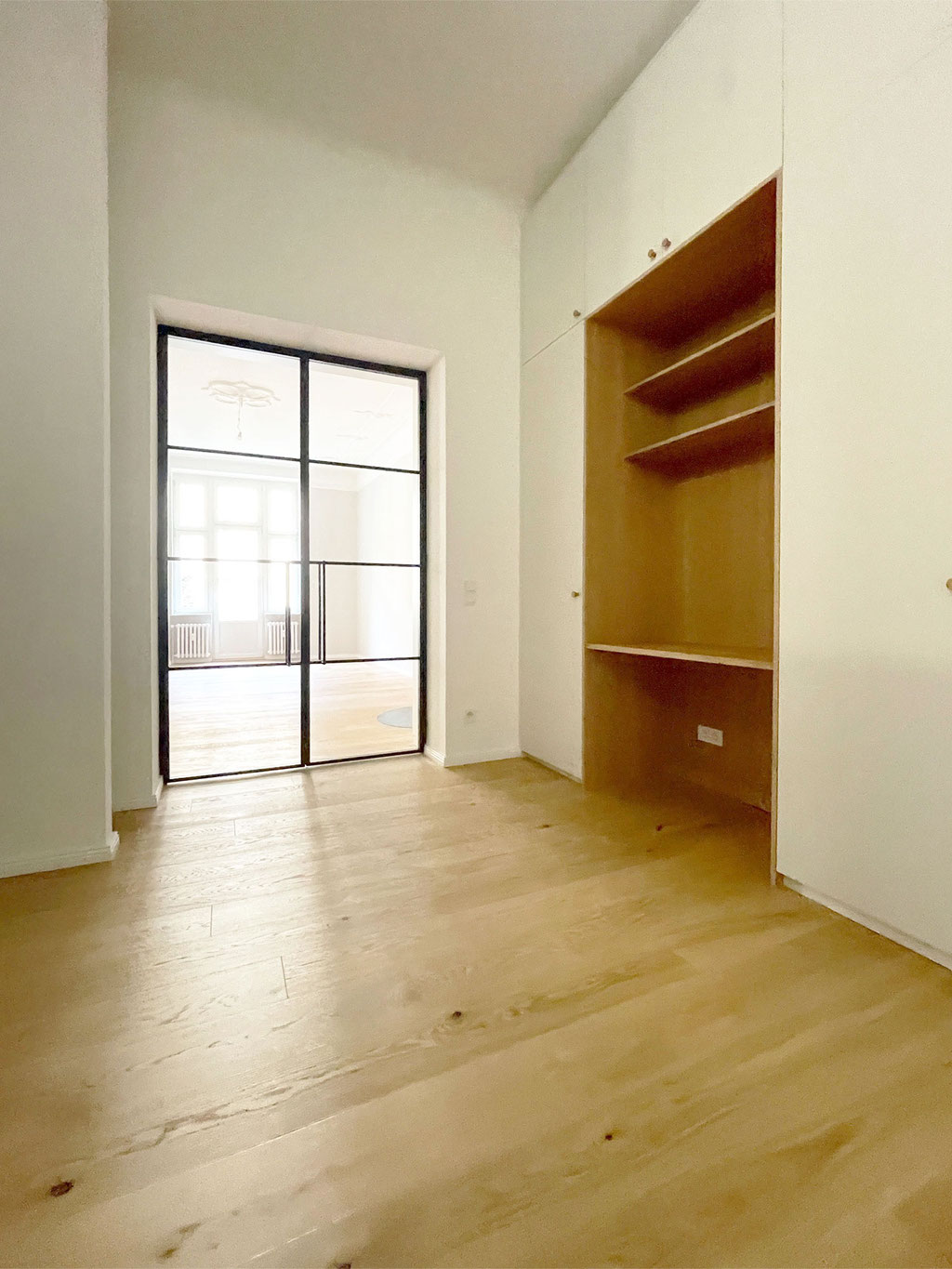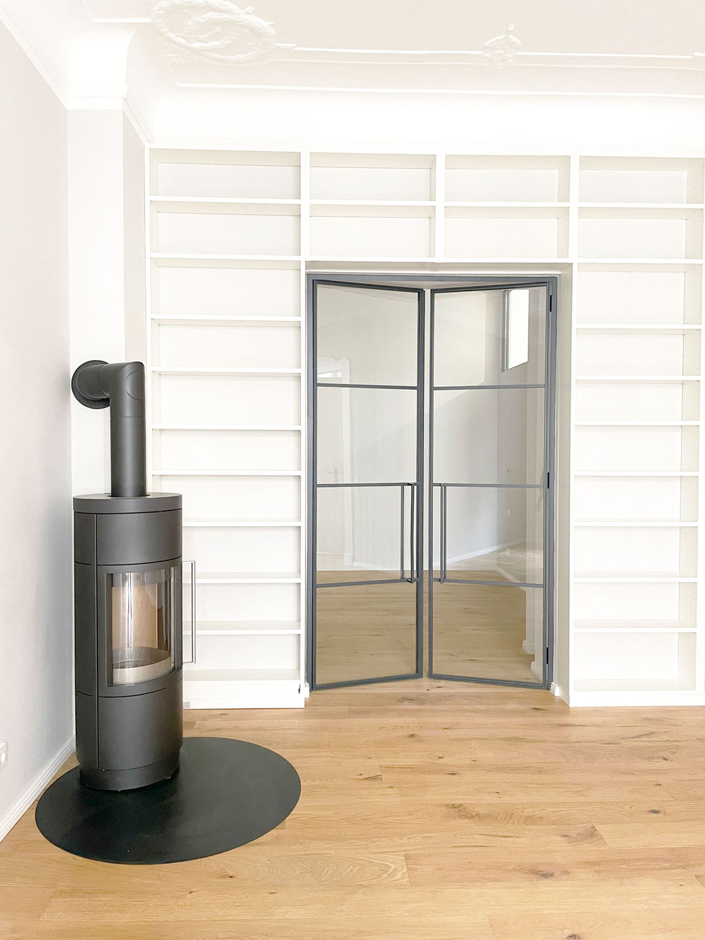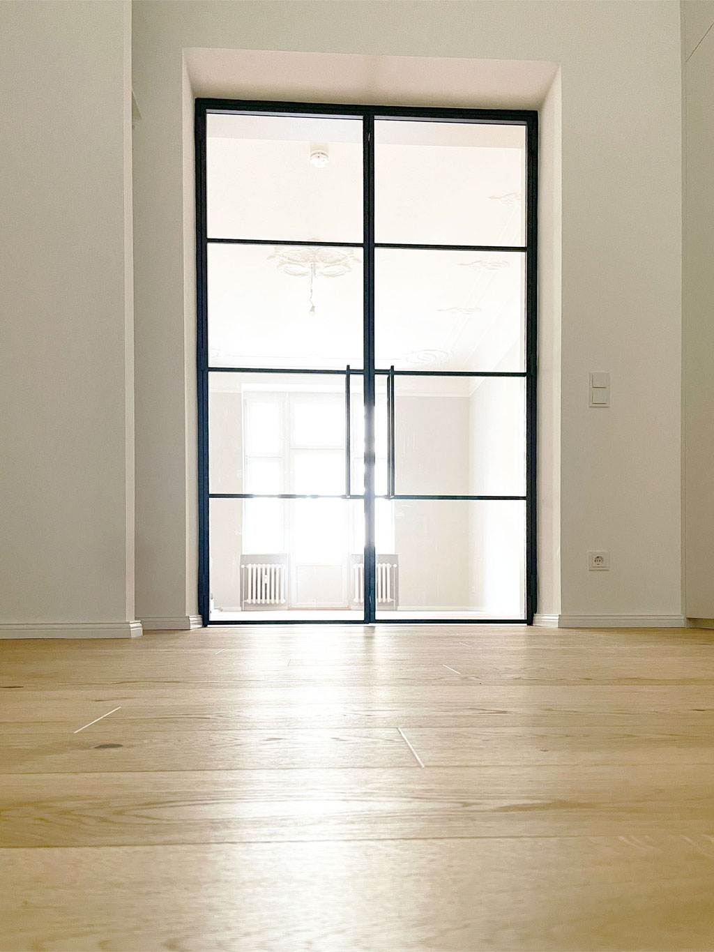 Einbau einer raumhohen Stahl-Loft-Tür als Verbindung zwischen Wohn- und Schlafzimmer