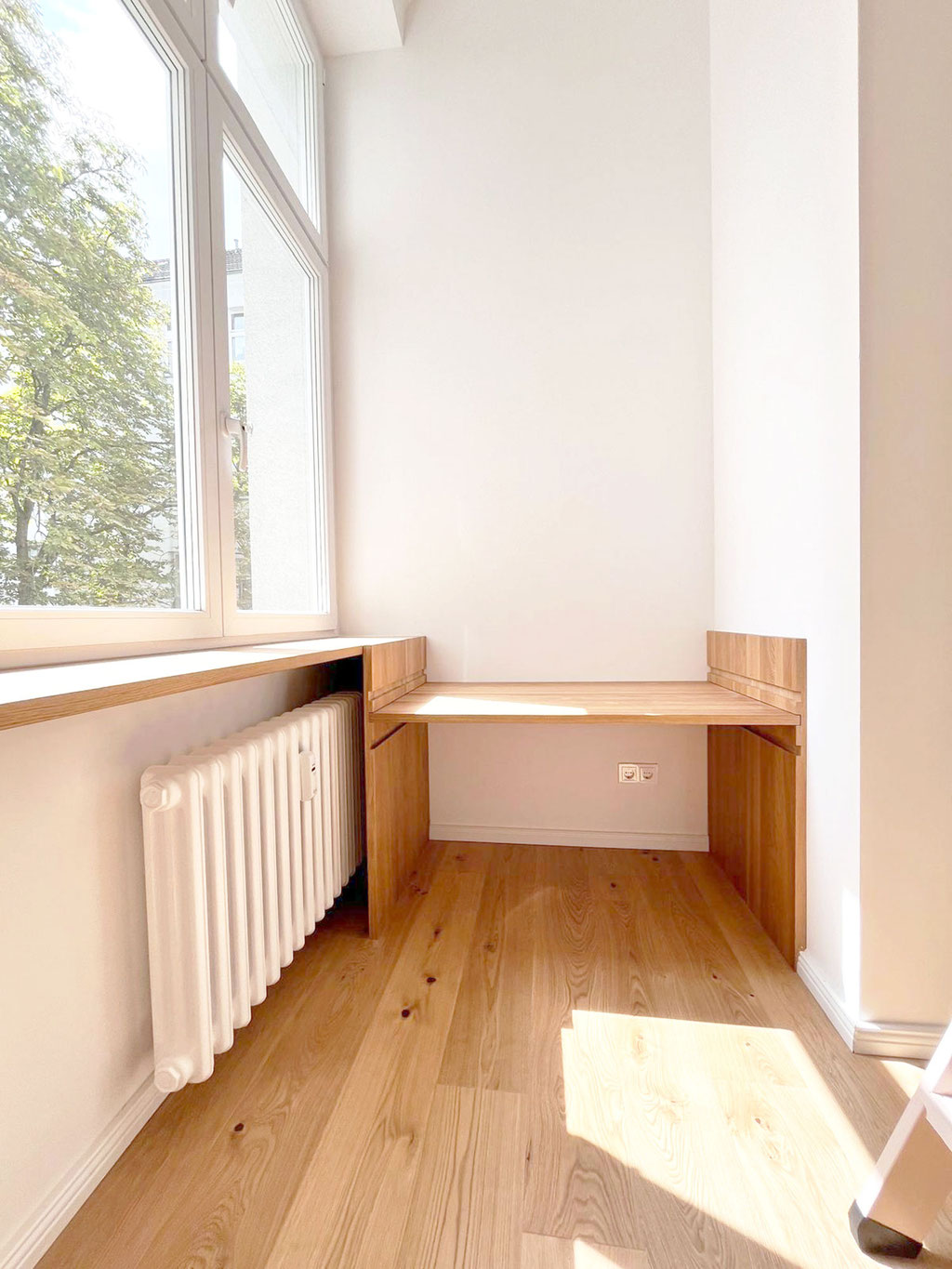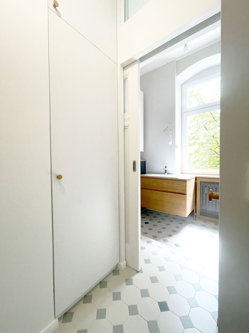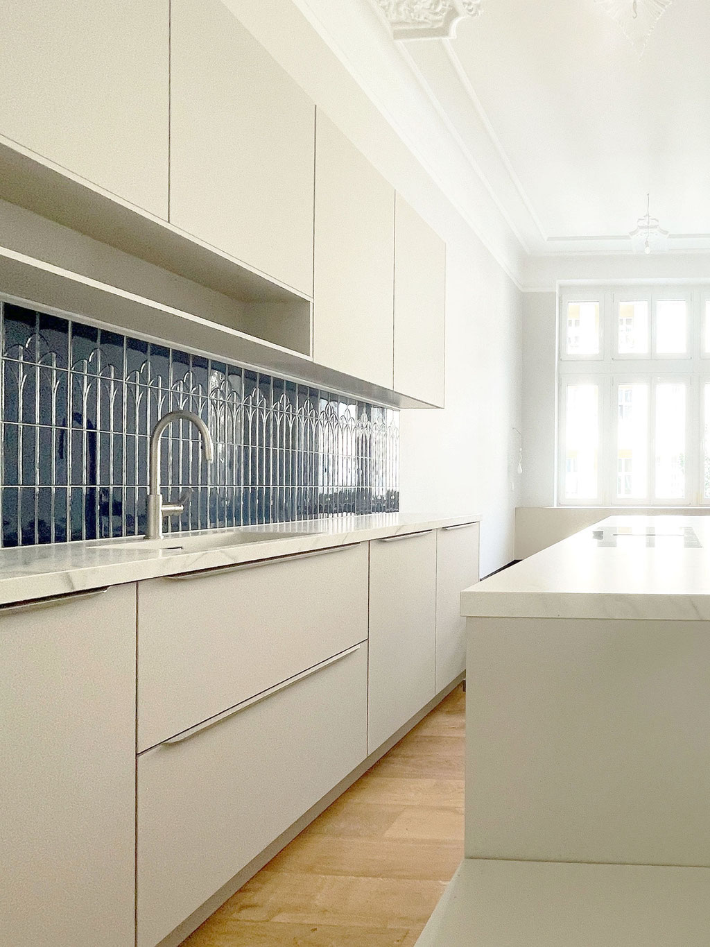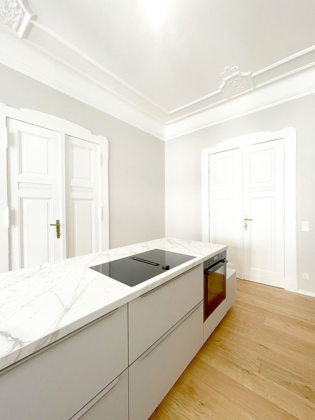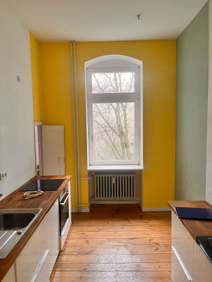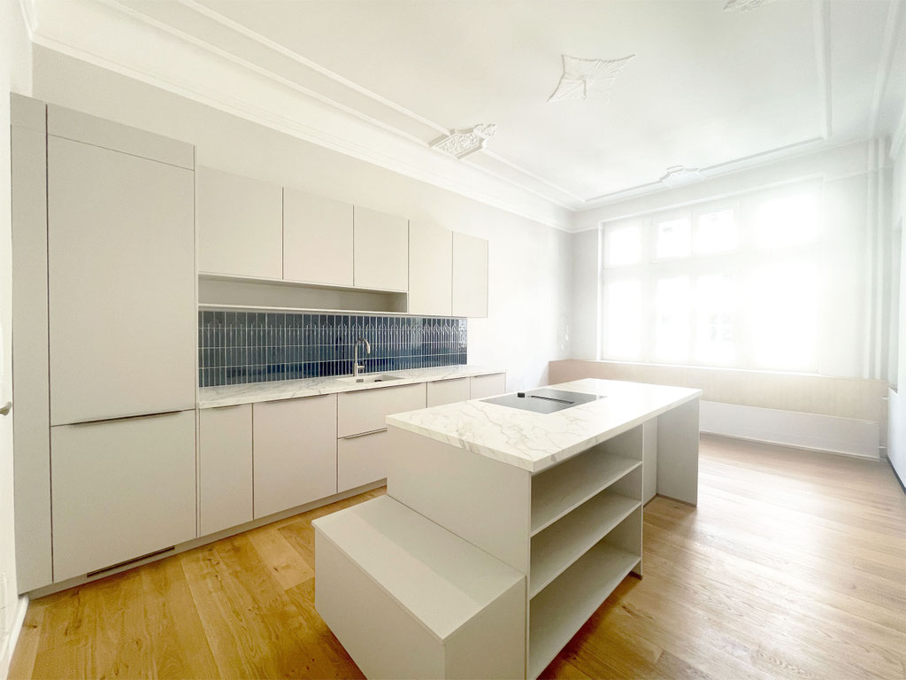 Verlegung der Küche ins lichtdurchflutete Erkerzimmer, neue Einbauküche mit Mittelinsel und Möbeleinbau